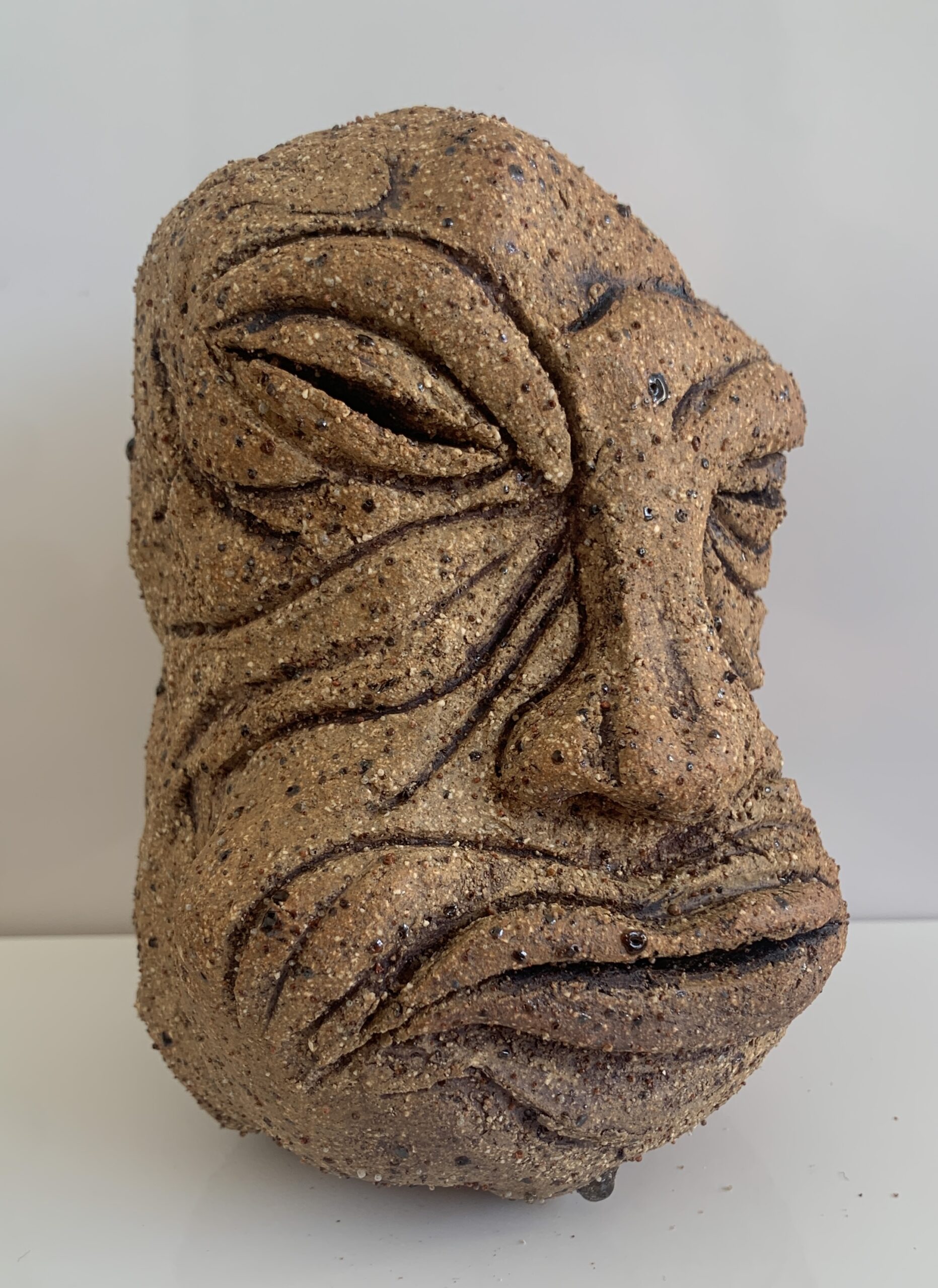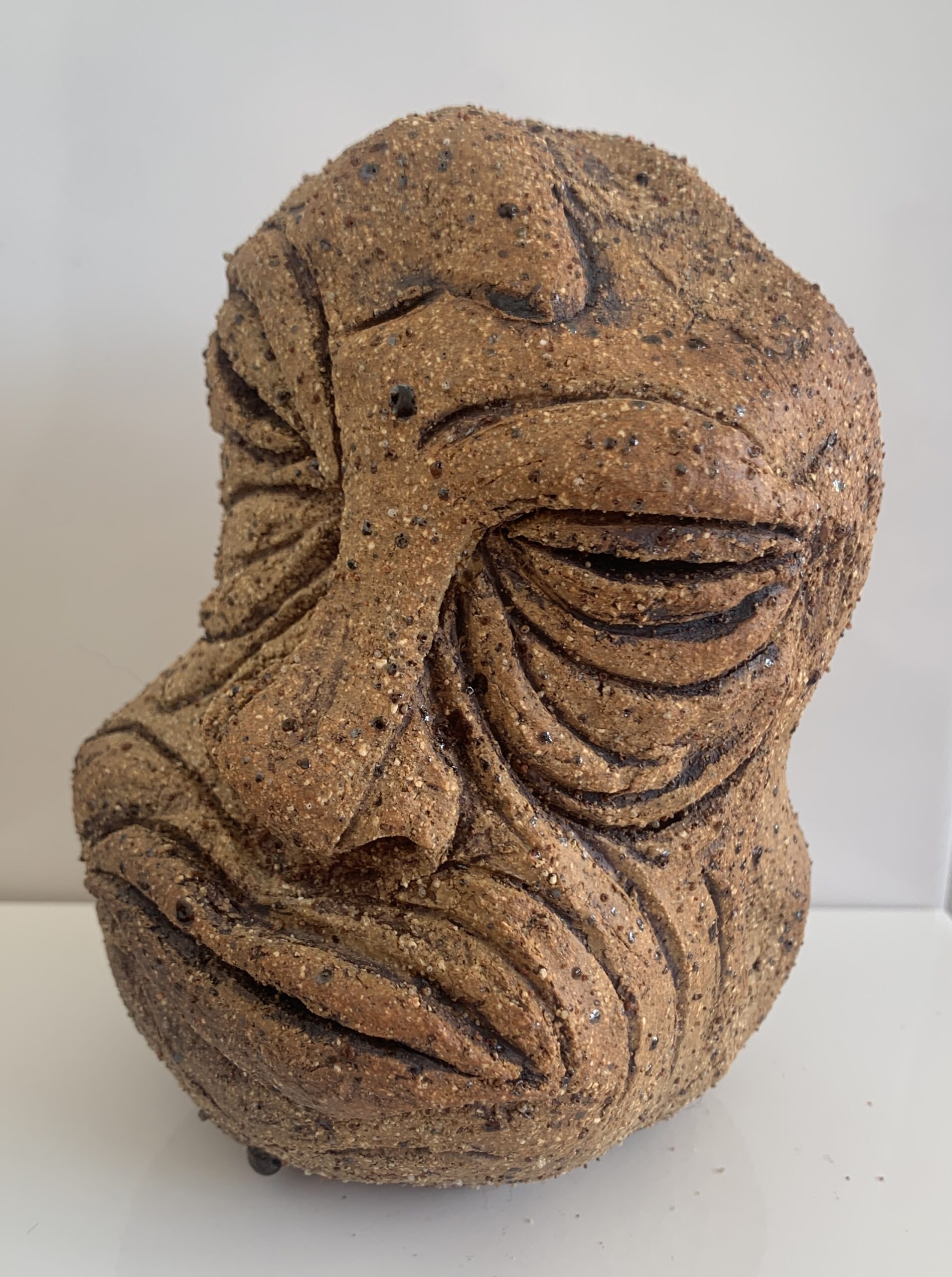 this ceramic head is made with buff raku trachyte clay with a simple iron oxide wash finish fired to stoneware. about the size of a grapefruit