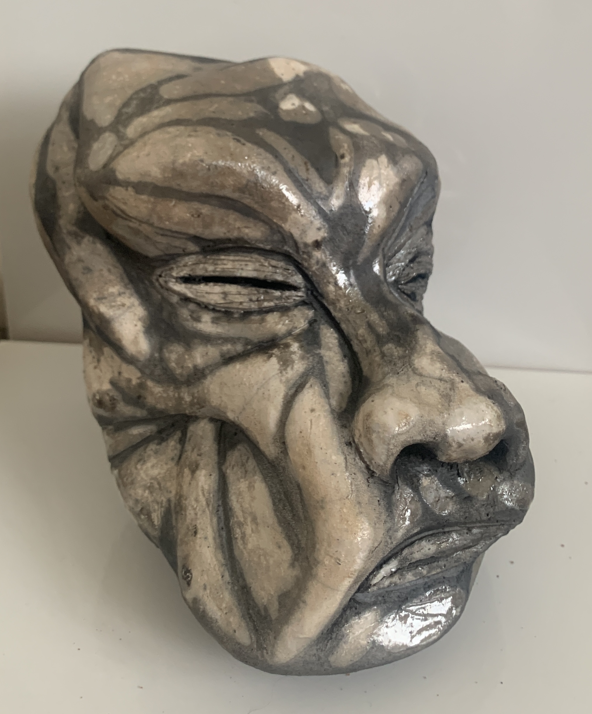 this ceramic head is made with white raku clay with a white crackle glaze finish raku fired. about the size of a grapefruit
